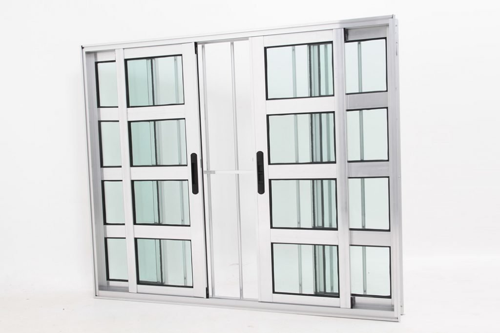 Janela Travessa em Alumínio Brilhante com 4 folhas e Grade