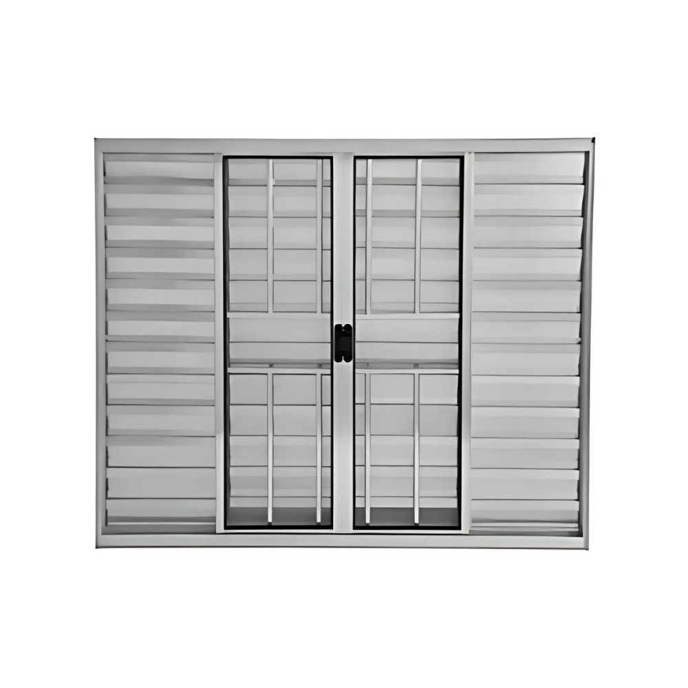 Essa Janela Veneziana é composta por 6 folhas, sendo 2 folhas venezianas fixa, 2 folhas venezianas móveis e 2 folhas de vidro liso e Grade de Proteção.