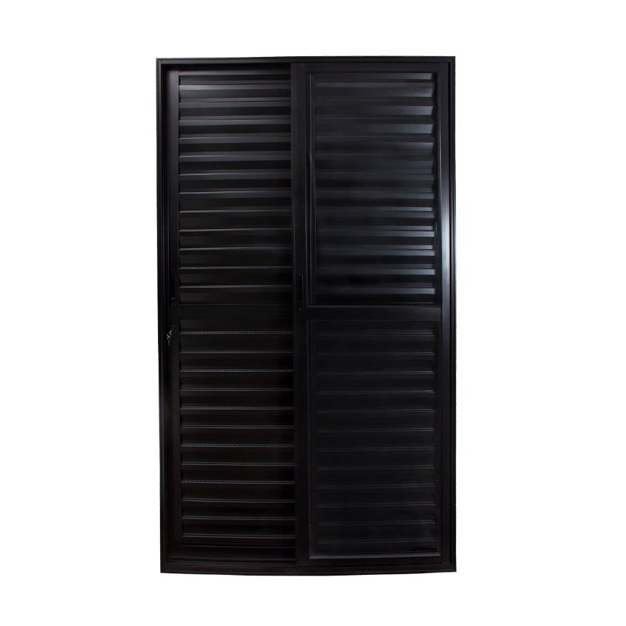 Porta Balcão 3 Folhas de Alumínio Preto. É composta por 3 folhas, sendo 1 folha veneziana fixa, 1 folha veneziana móvel e 1 folha de vidro liso incolor.