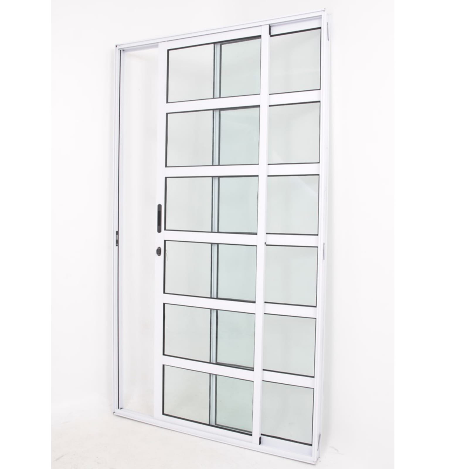 Essa Porta é composta por 1 folha fixa e 1 folha móvel , sendo que cada folha possui 6 requadros de vidro liso.